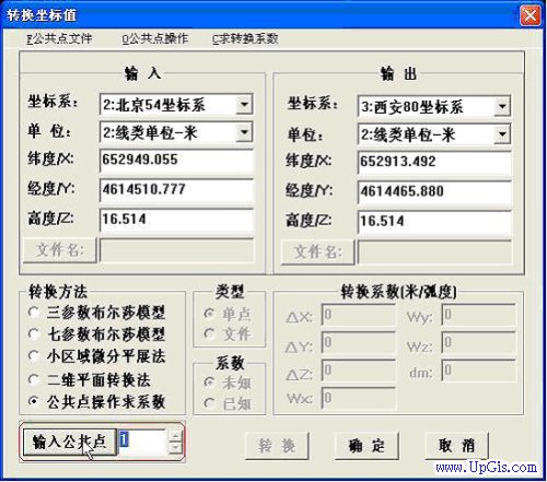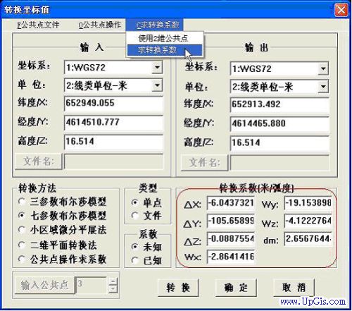 第三步:求公共点操作系数(菜单:投影转换——坐标系转换)。如果求出转换系数后,记录下来;
