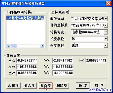 然后单击“添加项”按钮,则在窗口左边的“不同椭球间转换”列表中将该转换关系列出;