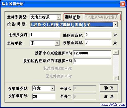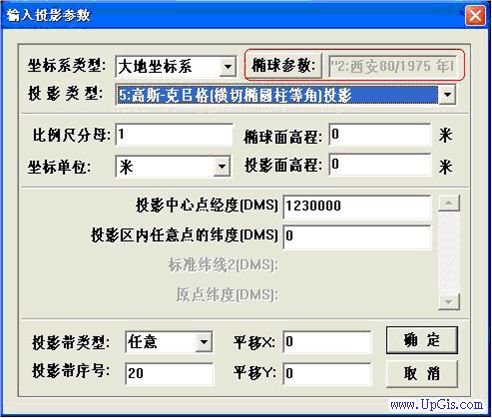 6、单击“投影转换”菜单下“设置转换后参数”命令,系统弹出“输入投影参数”对话框,如图7所示,转换后的参数设置为: