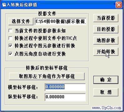 7、单击“投影转换”菜单下“进行投影变换”命令,系统弹出“输入转换后位移值”对话框,单击“开始转换”按钮,系统开始按照设定的参数转换线文件,如图8所示: