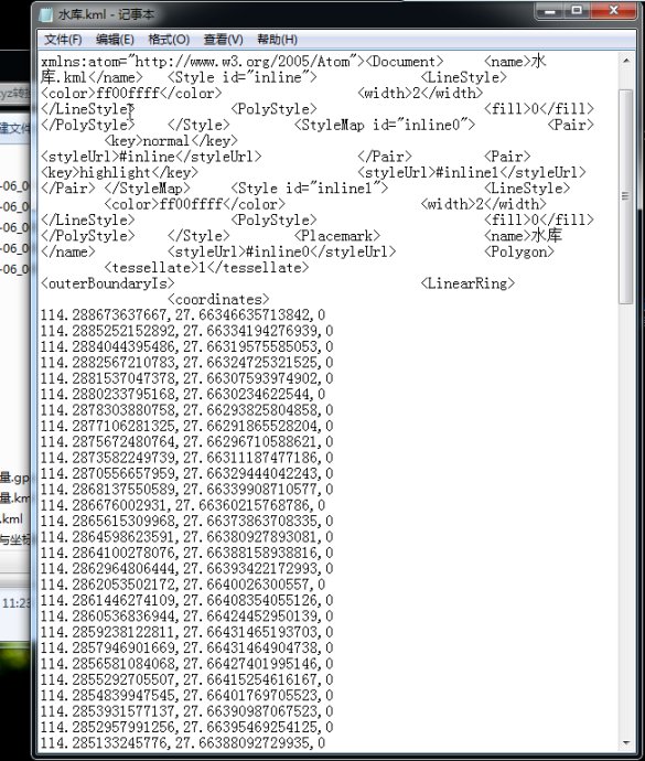 9、用记事本打开“水库.kml”,会看到里面有刚刚勾选的点的大地坐标