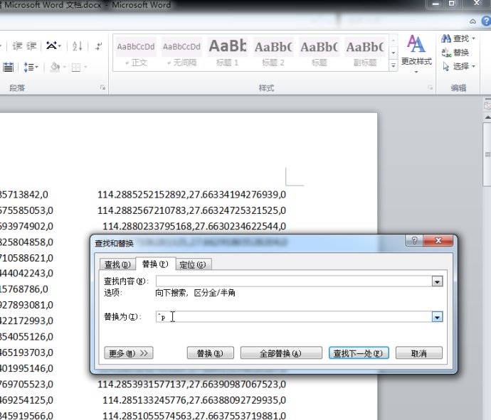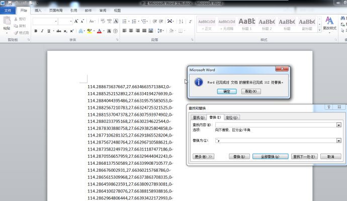 11、可以看到所有的大地坐标有规律的用空格连接,我们需要把他们分行,也就是每个坐标后面是回车