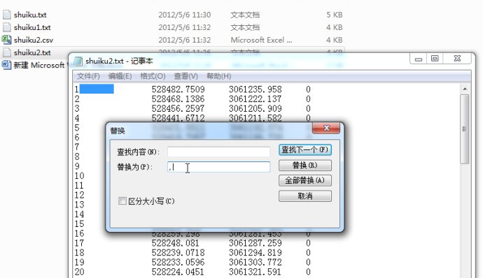 31、打开新得到的shuiku2.txt,发现很多空格,我们利用这些空格,制作成南方CASS格式的数据文件。