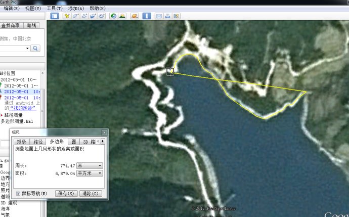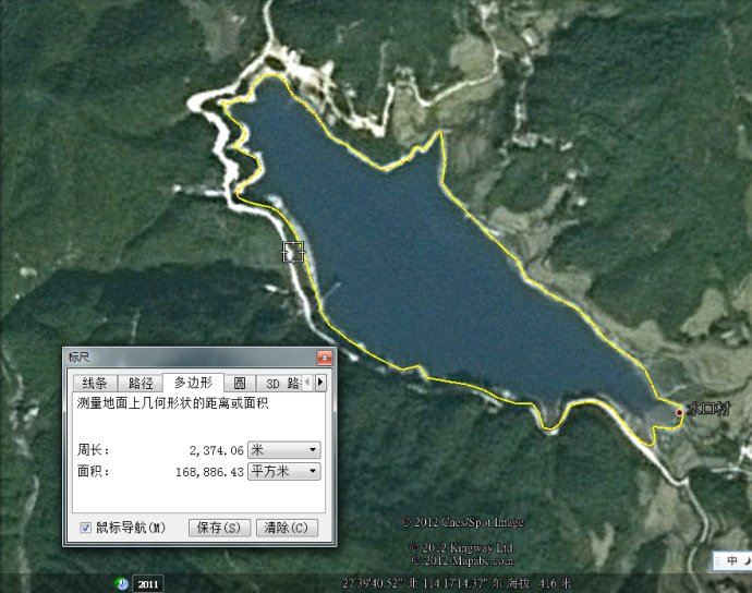 3、用鼠标勾选水库的轮廓,可以看到周长和面积即时反映在标尺窗口。